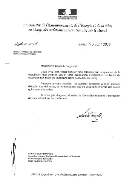 Mme Royal me répond le 5 Août, avec l'arrivée du courrier à la région que le 31 août, en expliquant qu'elle est attentive à ma requête. Cet aveu de nécessité de recyclage des MIA sur un site condamné suite au fiasco du procédé OXALOR montre à quel point ces politiques furent inutiles et coûteuses pour les deniers des picto-charentais. c'est d'autant plus évident que Mme Royal, elle même, mette ses services au travail pour étudier mes propositions. j'aurai aimé qu'elle le fasse aussi sur bien d'autres sujets lorsqu'elle était Président de notre belle région.